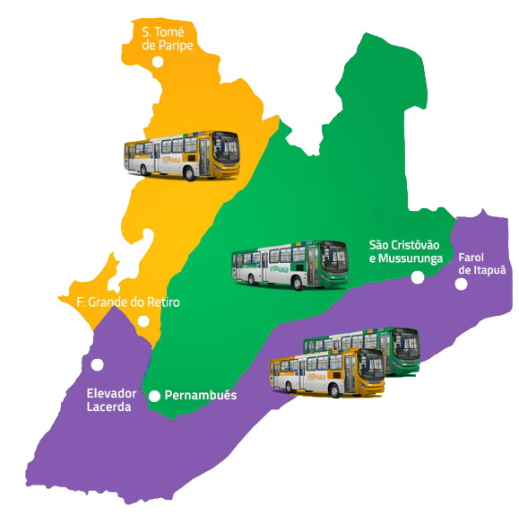 A cidade está dividida em três Áreas Operacionais — Subúrbio, Miolo e Orla/Centro — para melhor organizar o fluxo de passageiros, planejar e otimizar os serviços, garantindo ampla cobertura territorial e conexão entre diferentes regiões.